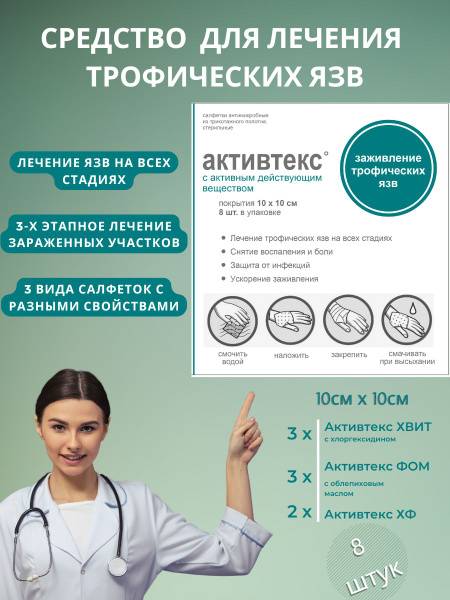 Keywords: Trophic ulcers, wound dressings, Activex, wound care, diabetic ulcers, venous ulcers, pressure sores, pressure ulcers, burn treatment, gangrene treatment, cellulitis treatment, phlegmon treatment, abscess treatment, antimicrobial, wound healing, rapid healing, easy application, comfortable dressings, healthcare, medical supplies.