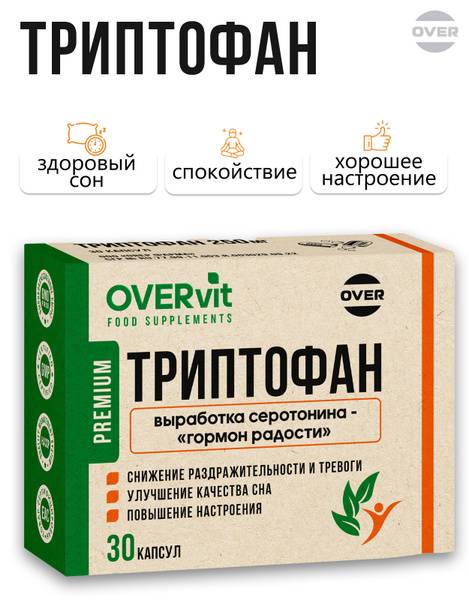 Tryptophan, sleep aid, insomnia, anxiety relief, depression supplement, mood enhancer, serotonin, melatonin, nervous system support, cognitive function, essential amino acid, stress management, sleep normalization, 30 capsules, dietary supplement, healthy sleep, emotional balance.
