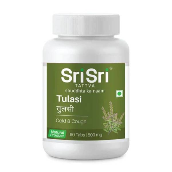 Tulasi, Holy Basil, Ocimum tenuiflorum, Ocimum sanctum, Sri Sri Tattva, Ayurvedic supplement, tablets, 60 tablets, herbal remedy, stress relief, immune support, respiratory health, digestive health, antioxidant, adaptogen, eugenol, cineole, blood sugar, cholesterol, anti-inflammatory, pain relief, eye health, India, Ayurvedic medicine.
