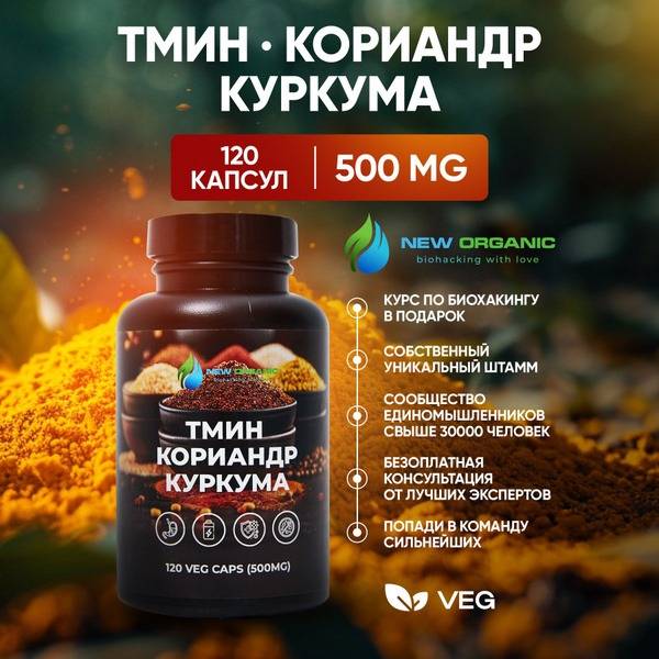 Experience the combined power of turmeric, cumin, and coriander in one convenient capsule! This natural blend supports healthy digestion, detoxification, and immune function. Our organic supplement gently promotes regularity, improves gut motility, and nourishes your digestive system with essential micronutrients. It helps alleviate bloating, constipation (in adults), and may aid in preventing pancreatitis and managing irritable bowel syndrome (IBS). The synergistic action of curcumin, cumin, and coriander offers a wide range of benefits, including: inflammation reduction, improved appetite and digestion, blood sugar support, colon cleansing, edema reduction, toxin removal, hormone balance, increased energy levels, cholesterol reduction, immune system boosting, enhanced sleep quality, antispasmodic, anti-inflammatory, and antibacterial effects, gentle weight management, and antioxidant protection against cellular damage. Embrace a healthier, happier you with New Organic's convenient and effective all-natural supplement. Start your journey to better digestive health today!