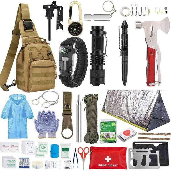 Description: Be ready for anything with this comprehensive 33-piece survival kit. Equipped for earthquakes, typhoons, floods, and more, it includes essential tools like a survival whistle, tactical pen, emergency blanket, multi-tool, first-aid supplies (including bandages, antiseptic, and tweezers), a chainsaw, and even fishing gear. When disaster strikes and help is delayed, rely on this kit for self-rescue and aid for others. Prepare for power outages, communication disruptions, and inaccessible roads. Don't wait – ensure your safety and the safety of your loved ones.