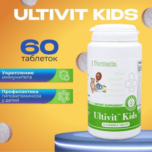 Keywords: Ultivit Kids, Santegra, children's vitamins, multivitamin, chewable tablets, immune support, growth, development, vitamins A, C, D, E, B vitamins, zinc, iron, iodine, child health, kids health supplements, healthy kids, no artificial colors, no preservatives, sugar-free, allergen-free, children's multivitamin, hypovitaminosis prevention, cognitive function, energy levels, healthy bones, healthy skin, healthy hair, healthy nails.