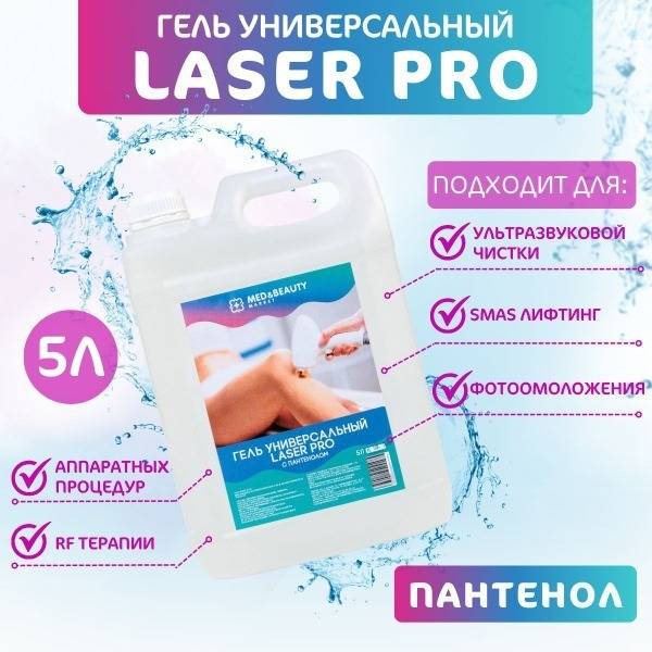 Experience superior results with LASER PRO, a 5-liter multi-purpose contact gel ideal for a wide range of professional skincare treatments. This medium-viscosity gel is perfect for ultrasound cleansing, laser epilation, photorejuvenation, SMAS lifting, ultrasound cavitation, and RF lifting – especially when your device manufacturer advises against emulsion-based gels. LASER PRO provides excellent contact and cooling during procedures, ensuring patient comfort. Its non-irritating formula, enriched with panthenol, is suitable for all skin types. The gel applies smoothly, prevents spreading, and allows for extended treatment times. It leaves no residue, won't damage your equipment's sensors, and is easily removed with water or a wipe. pH 6.5-7.0. Ingredients: Demineralized water, glycerin, panthenol, hydroxyethyl urea, carbomer, sodium hydroxide, preservative, and auxiliary components. Important: Always refer to your device's instructions for use. Also available: MICROTOK conductive gel.