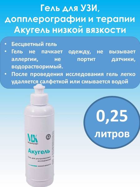 Ultrasound gel, Akugel, low viscosity, 0.25kg, ultrasound examination, Doppler, therapy, phototherapy, photorejuvenation, IPL, BBL, photoepilation, laser epilation, vacuum massage, shockwave therapy, SMAS lifting, sonophoresis, cavitation, medical gel, cosmetic gel, coupling agent, contact gel.