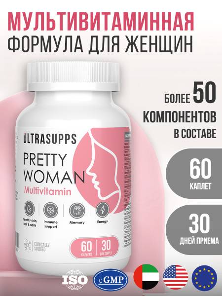 women's multivitamin, women's health supplement, vitamins for women, multivitamin complex, immune support, skin health, hair health, energy boost, metabolism support, anti-aging, hyaluronic acid, collagen, vitamins for hair growth, UltraSupps, Pretty Woman, 60 capsules, vitamin D, women's vitamins 40+, women's vitamins 50+, biotin, folic acid, B vitamins, minerals for women.