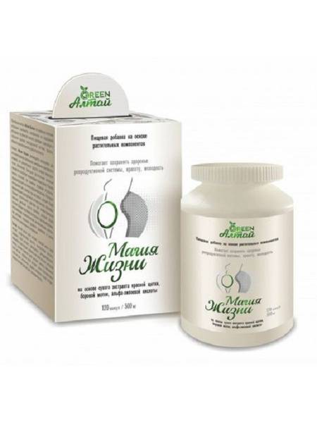 Keywords: Magia Zhizni, women's health supplement, herbal capsules, menopause relief, hormonal balance, menstrual cycle regulation, fertility support, antioxidant, anti-inflammatory, red brush, boron uterus, alpha-lipoic acid, hyaluronic acid, cimicifuga, PMS, mastopathy, hot flashes, natural ingredients, dietary supplement, women's health, reproductive health, beauty supplement, energy booster, 120 capsules, Ambrella.