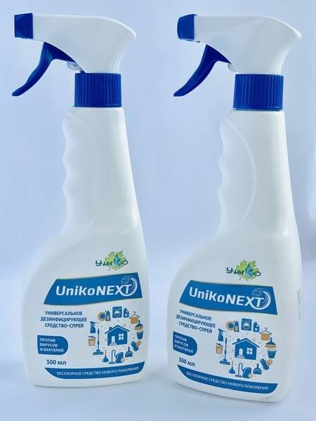 Description: UnikoNEXT is a powerful, odorless disinfectant effective against a wide range of pathogens, including viruses (including COVID-19), bacteria, fungi, and hospital-acquired infection microorganisms. It's safe for use on various surfaces – from hard furniture and equipment to linens, dishes, and even children's toys – without damaging them. UnikoNEXT is ideal for disinfecting homes, public spaces, transportation, beauty salons, and more. This two-pack contains two 500ml bottles.