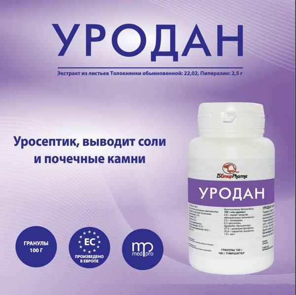 Description: Urodan's unique formulation combines lithium and piperazine salts with uric acid, forming readily soluble compounds that facilitate efficient uric acid excretion from the body, promoting kidney stone dissolution and prevention. This aids in reducing the risk of future stone formation.