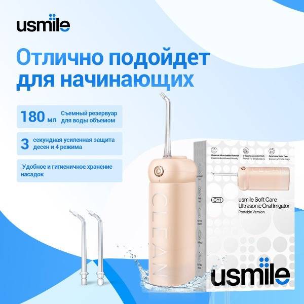 The usmile CY1 portable oral irrigator is perfect for beginners. Improper cleaning can lead to various oral problems including bleeding gums, yellowing teeth, bad breath, and cavities. This mini irrigator features 3-second pulse intensification technology and micro-bubble cleaning for gentle gum care and bleeding prevention. Its removable 180ml water tank and dual nozzle design ensure convenient use. Ultrasonic water flow technology provides superior cleaning power, effectively removing food particles between teeth without harming gums. Choose from 4 cleaning modes to address specific needs: complex tooth placement, fillings, sensitivity, and daily cleaning. Three professional nozzles – standard, sensitive, and periodontal – offer customized care. Enjoy 90 days of battery life and IPX7 waterproof protection for worry-free use. Quiet operation at just 65dB.