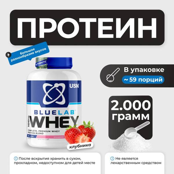 Description: Fuel your fitness goals with USN BlueLab Whey Protein, a premium strawberry-flavored whey protein powder. This 2kg tub provides a high-protein boost to support muscle growth, recovery, and overall well-being. Experience superior quality, fast-absorbing whey protein for optimal results. Perfect for post-workout recovery or adding a protein boost to your daily diet. Order your USN BlueLab Whey today!