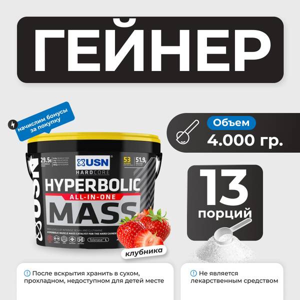 Achieve your ultimate physique with USN Hyperbolic MASS 4000g Strawberry Gainer. This powerful weight gainer formula is designed to support serious muscle growth and strength gains. Packed with high-quality whey protein isolate, complex carbohydrates, and essential nutrients, Hyperbolic MASS provides the fuel your body needs for intense workouts and rapid recovery. The delicious strawberry flavor makes it easy to enjoy every serving. Experience the difference of a premium mass gainer – order your USN Hyperbolic MASS today and start building the body you've always wanted! This 4000g (4kg) high protein gainer is perfect for bodybuilders, athletes, and fitness enthusiasts looking for the best mass gainer for muscle growth. Find out what makes USN Hyperbolic MASS the best strawberry flavored weight gainer on the market. Read USN Hyperbolic MASS reviews and see where to buy USN Hyperbolic MASS.