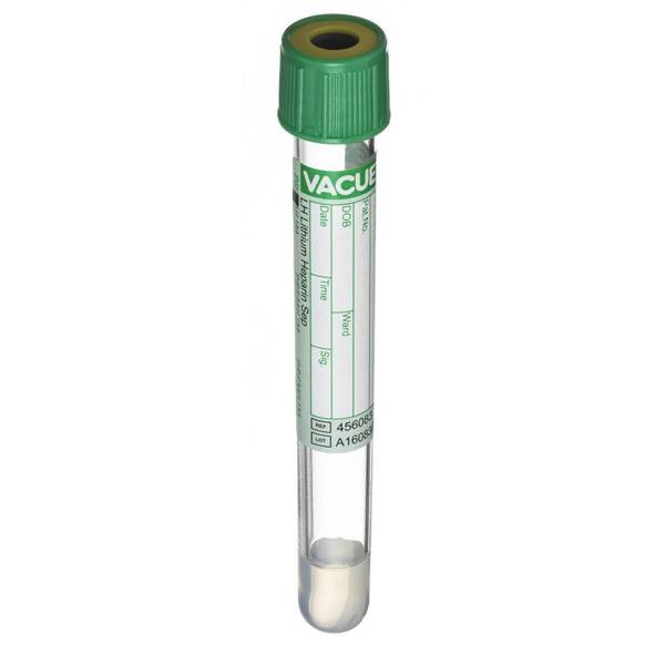High-quality 5ml plastic (PET) VACUETTE 456083 vacuum blood collection tubes with lithium heparin and gel separator. Ideal for plasma biochemistry and rapid diagnostic testing. Features a rubber stopper and an additional protective plastic cap with vertical grooves and screw thread. Includes a paper label and green color-coded tube. Packaged in a polystyrene rack, shrink-wrapped, and clearly labeled. 50 tubes per pack.