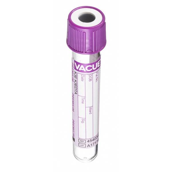 High-quality 1ml Vacuette blood collection tubes with K3 EDTA anticoagulant, ideal for hematology, routine immunohematology, and molecular genetic testing. These plastic (PET) tubes feature a rubber stopper and an additional protective plastic cap with vertical grooves and a screw thread for enhanced safety. The tubes are color-coded purple for easy identification and come with a paper label. Packaged 50 tubes per pack in a polystyrene rack, shrink-wrapped for secure transport and storage. Guaranteed vacuum integrity for reliable sample collection and analysis.