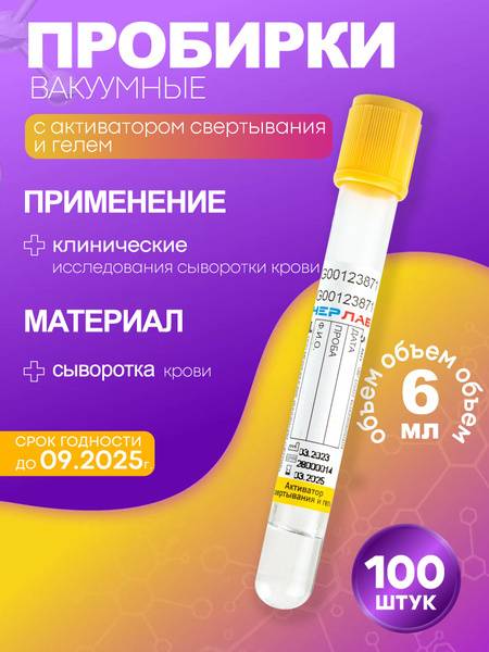 These sterile, single-use vacuum blood collection tubes are designed for efficient and reliable venous blood collection. Each 6ml tube measures 13x100mm and contains a clot activator for rapid clotting and a serum separator gel to effectively separate serum from cells during centrifugation. This ensures accurate and reliable results for various laboratory analyses, including serum chemistry. The tubes are pre-filled with a precise vacuum for easy and consistent blood draw. Ideal for clinical laboratories, hospitals, and diagnostic testing facilities. This 100-pack offers excellent value and convenience. Expiry date: 07/2025.