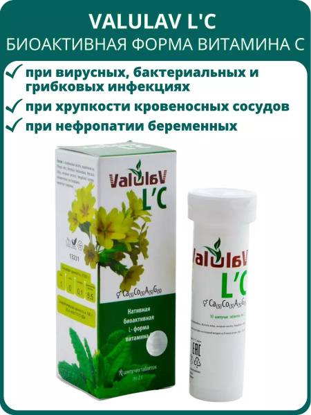 ValulaV L'C, Vitamin C, Bioactive Vitamin C, Native Vitamin C, L-ascorbic acid, Effervescent Tablets, Immune Support, Antioxidant, Bioavailability, Primula veris, Kakadu Plum, Camu Camu, Pregnancy, Breastfeeding, Anemia, Skin Health, Hair Health, Nail Health, Wound Healing, Scurvy, Hemorrhagic Diatheses, Liver Support, Stress Relief, Fatigue, Physical Performance, Mental Performance, Antioxidant Supplement, Dietary Supplement.
