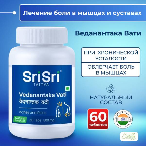 Sri Sri Tattva Vedanantaka Vati, Ayurvedic medicine, muscle pain relief, joint pain relief, gout treatment, chronic fatigue relief, back pain relief, renal tonic, anti-urolithic, polyarthritis support, herbal pain relief, natural pain relief, 60 tablets, Ayurvedic pain relief, muscle aches, joint aches, swelling, inflammation.