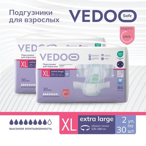 VEDOO Safe adult diapers offer superior comfort and protection for individuals with moderate to heavy incontinence. These eco-friendly diapers are made with hypoallergenic, soft materials certified by OEKO-TEX Standard 100 (ISO 174279), ensuring they are free from harmful substances.