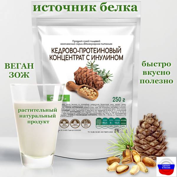 This Siberian pine nut protein concentrate with inulin is a natural, plant-based supplement designed for the modern active individual. Perfect for building and maintaining muscle mass or supporting weight loss, it's made without heat or chemical processing. Boasting four times the easily digestible protein of whole pine nuts (containing all essential amino acids) and six times less fat, this concentrate delivers all the benefits of Siberian pine nuts in a highly concentrated form. Rich in Omega-3 fatty acids, it promotes heart health by preventing blood clot formation, lowering cholesterol, and cleansing blood vessels, including those in the brain. It strengthens the heart muscle and capillaries, improves their elasticity, and reduces blood pressure and the risk of cardiovascular disease. The natural vitamin complex enhances memory, concentration, and overall cognitive function. A truly powerful and healthy vegan protein source.
