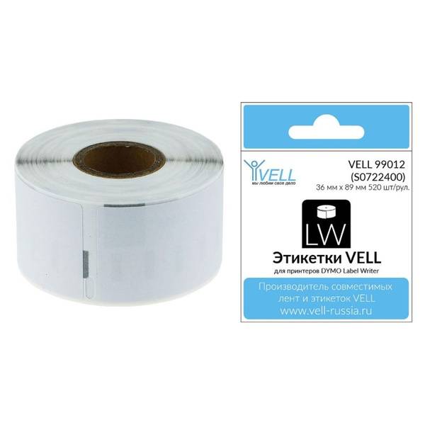 Vell VL-D-99012/S0722400 (36x89mm, white) label tape offers versatile labeling solutions for offices and warehouses. This high-quality paper tape is ideal for creating custom labels featuring barcodes, logos, graphics, and text. Perfect for a wide range of applications, including folder tabs and product identification. Each roll provides 260 labels, with two rolls (520 labels total) included per package. The crisp white background ensures clear, legible printing. Specifically designed for use with LabelWriter 400, 450, and 450 Turbo printers. Upgrade your labeling efficiency with this durable and reliable solution.