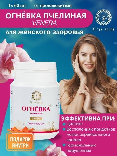 Venera, a natural supplement from Altyn Solok, harnesses the power of Greater Wax Moth larvae extract, royal jelly, and a unique blend of herbs to support women's health. This non-hormonal formula addresses various gynecological concerns, including inflammation of the urinary and reproductive systems (cystitis, adnexitis, cervicitis), hormonal imbalances, and infertility. Venera's unique combination of enzymes, vitamins, and minerals improves fertility, boosts the immune system, and promotes overall well-being. Its powerful anti-inflammatory, bactericidal, and wound-healing properties help alleviate symptoms associated with endometriosis, fibroids, and menopausal discomfort. This effective complex facilitates the resorption of cysts, normalizes menstrual cycles, reduces menstrual pain, and enhances libido. Venera supports a healthy reproductive system, restoring hormonal balance and improving the overall function of the female body. It is ideal for women of all ages seeking to improve their reproductive health, boost energy levels, and experience a greater sense of well-being. Not a drug.