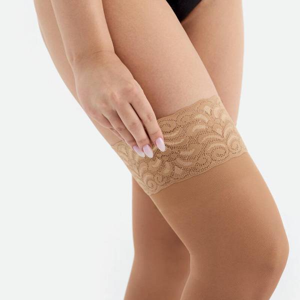 Experience superior comfort and support with Venoteks Trend Class 1 (15-21 mmHg) sheer beige compression stockings. These lightweight, breathable compression stockings alleviate leg fatigue, reduce swelling, and help prevent the progression of varicose veins. Made with a delicate, hypoallergenic, latex-free material (74% nylon, 26% elastane), they're perfect for everyday wear, even during warmer months. The anatomical design ensures a perfect fit and even pressure distribution, while reinforced toe and heel areas enhance durability. A stylish, lacy top band adds a touch of elegance. Convenient size markings inside the toe ensure easy repurchase. A 6-month guarantee on compression properties with daily use provides peace of mind. Ideal for: evening leg swelling, fatigue, mild varicose veins, pregnancy (from the first trimester), and a family history of venous disease. Find your perfect fit using our detailed size chart (measurements should be taken in the morning before swelling occurs).