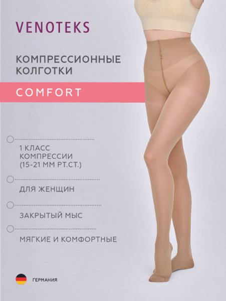 Experience luxurious comfort with Venoteks Beige Compression Stockings. These silky-smooth, 1st class compression (15-21 mmHg) stockings are crafted with 55% micro-nylon for exceptional warmth and durability, perfect for colder months. Designed for women seeking relief from tired, heavy legs and minor aches, they provide gentle support and are ideal for those with sedentary or standing jobs, and for early stages of venous insufficiency. Venoteks Comfort stockings help prevent fatigue and reduce swelling, offering gentle support without excessive pressure. Recommended for pregnancy (from the 1st trimester), and for those with a hereditary predisposition to venous disease, mild varicose veins, or spider veins. These medical-grade stockings are designed for comfort and long-lasting wear, featuring reinforced toe and heel areas. ФСЗ 2012/13480