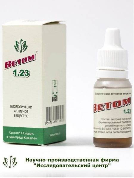 Vetom 1.23 is a dietary supplement presented as a light yellow to dark brown liquid with a distinctive odor. A slight insoluble sediment may be present. It's packaged in glass or polymer bottles, each enclosed in a cardboard box with instructions for use.