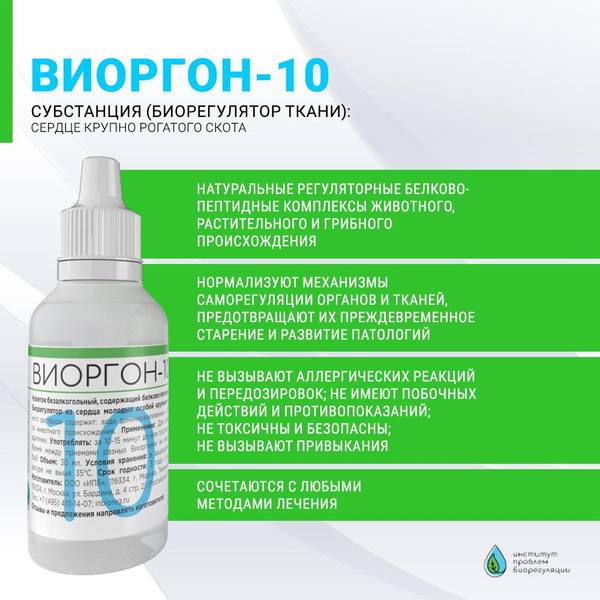 Viorgon-10 is a dietary supplement supporting cardiovascular health. Indicated for ischemic heart disease (IHD), angina pectoris, chronic heart failure, heart defects, all types of arrhythmia (extrasystole, bradycardia, tachycardia, atrial fibrillation), hypertension, hypotension, myocardial infarction prevention and post-infarction rehabilitation, post-infarction cardiosclerosis, myocardiodystrophy, cardiomyopathy, post-cardiac bypass surgery, stenting, and other postoperative conditions. It also supports cardiac function during complex therapy in the recovery period after infectious (and other) diseases, including influenza, acute respiratory viral infections (ARVI), and post-COVID-19 syndrome. Viorgon-10 works by regulating heart activity, providing protective effects on cardiac function, maintaining and regulating heart contractions, and supporting the structure and viability of heart wall cells and their adhesive interactions. Recommended for use with Viorgon-1 (Vigotin) for enhanced effects. 30ml (~600 drops), one month supply. A two-month course is recommended. Consult us for personalized advice.