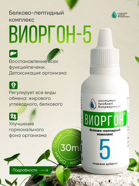 <hr>Discover Viorgon-5, a premium protein-peptide complex designed to support your liver health, bolster immune function, and address endocrine imbalances. This advanced dietary supplement is indicated for improving liver detoxification, protecting liver cells from toxins, and normalizing fat, carbohydrate, and protein metabolism. Viorgon-5 is beneficial for various liver conditions including viral and toxic hepatitis (A, B, C, D), fatty liver disease, hepatomegaly, Gilbert's syndrome, gallstones, and cirrhosis of viral or toxic-alimentary origin. It also supports individuals with immunodeficiency, endocrine disorders, post-operative recovery, and those experiencing neoplastic conditions and metastases. Viorgon-5 works by regulating intercellular interactions in liver tissue, stabilizing hepatocyte membrane permeability, stimulating regenerative processes, supporting cytochrome P-450 activity, and activating Kupffer cells. Each 30ml bottle (approx. 600 drops) provides a one-month supply. For optimal results, a 2-month course is recommended. Consult our specialists for personalized intake guidance.