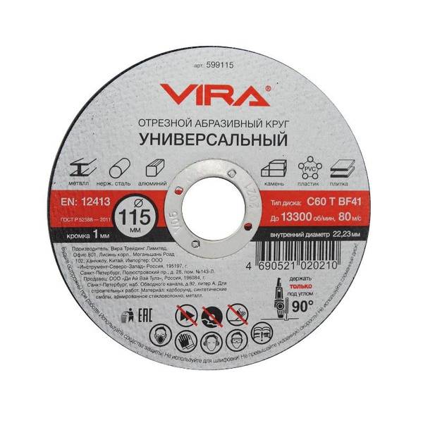 "description": "The VIRA metal cutting disc (599115) is a versatile, high-performance abrasive disc designed for use with angle grinders. Its robust construction ensures efficient and precise cutting across a wide range of materials, including metal, stainless steel, aluminum, stone, plastic, and tile. This 115mm diameter disc boasts a 1mm cutting edge thickness and a 22.23mm inner diameter, making it compatible with most standard angle grinders. The C60 abrasive grain provides a medium grit for optimal cutting performance, while the T (very hard) designation and BF (synthetic resin bond with fiberglass reinforcement) construction deliver exceptional durability and extended lifespan. The flat (Type 41) design ensures consistent and reliable cutting.",