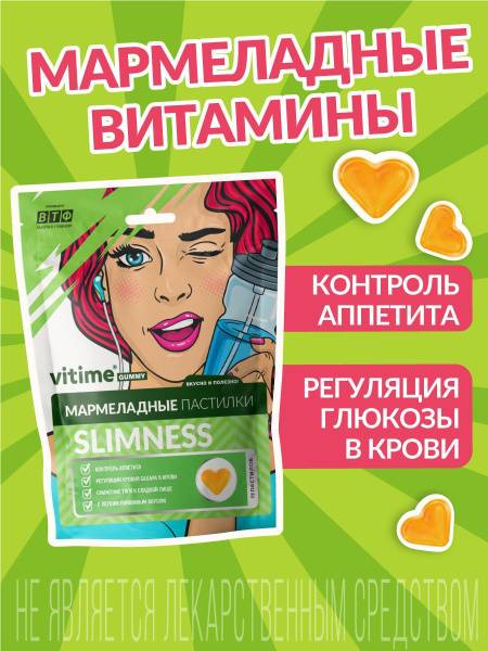 VITimeĀ® Slimness Gummies offer a unique blend of beneficial substancesāinulin prebiotic, chromium, and glucomannanāto help curb hunger, reduce cravings for sweets and flour-based products, normalize macronutrient metabolism, and maintain healthy blood sugar levels. Overeating and increased appetite often lead to weight gain, cardiovascular problems, diabetes, and dissatisfaction with one's appearance. Providing your body with timely support in combating unhealthy eating habits is crucial.