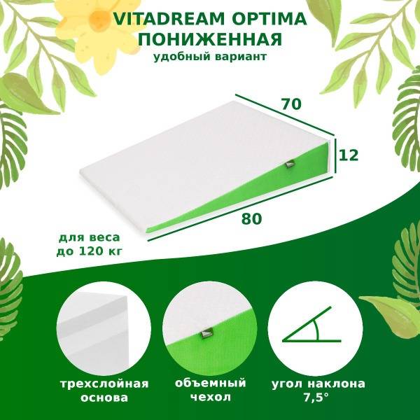 Keywords: wedge pillow, reflux pillow, back pain pillow, memory foam pillow, orthopedic pillow, 70x80cm pillow, 12cm pillow, VITADREAM, sleep aid, acid reflux pillow, comfortable pillow, hypoallergenic pillow, removable cover, polyester cover, cotton pillowcase, made in Russia, low profile wedge pillow.