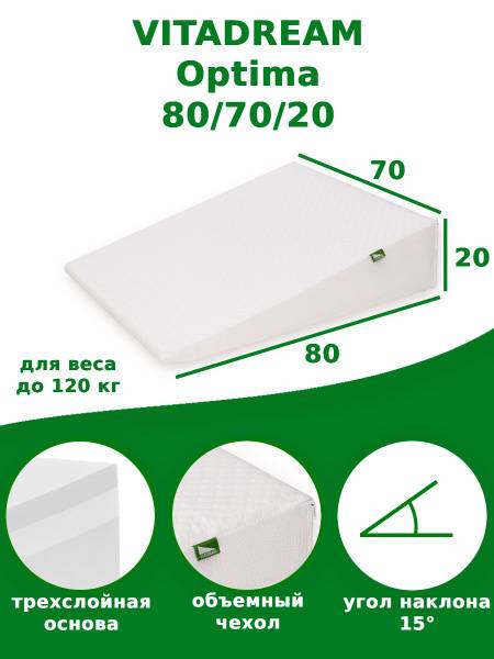 Description: Experience superior comfort and support with the new VITADREAM Optima Wedge Pillow. This 70x80cm pillow features a 15-degree incline, perfectly designed for elevating your head and upper body. Its three-layer construction utilizes high-density foam for robust support, a cushioning mid-layer, and a luxurious top layer of memory foam for pressure relief and conforming comfort. A soft, breathable cotton inner cover encases the foam core, while a removable, zippered outer cover crafted from plush polyester adds a layer of luxurious softness. The memory foam tip ensures a gentle, seamless transition. For added hygiene, consider our 100% cotton replacement cover (product code: 591516826). Made in Russia.