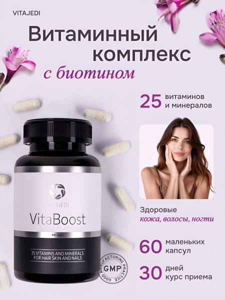 VITAJEDI VitaBoost is a comprehensive multivitamin complex specifically designed to promote youthful vitality and radiant health. Formulated with biotin (vitamin B7), this powerful blend targets hair, skin, and nail health, delivering noticeable results.