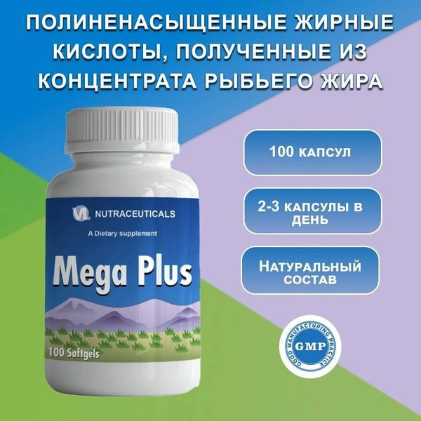 Mega Plus 1000mg provides natural, high-potency omega-3 fatty acids from concentrated fish oil. Supports cardiovascular health (high blood pressure, post-stroke recovery), brain function (Alzheimer's, dementia, memory loss, concentration), joint health (arthritis, arthrosis), and immune function. May also benefit skin health (psoriasis), bone health (osteomyelitis, fractures), and help reduce the risk of certain cancers. Suitable for adults and children (under adult supervision).