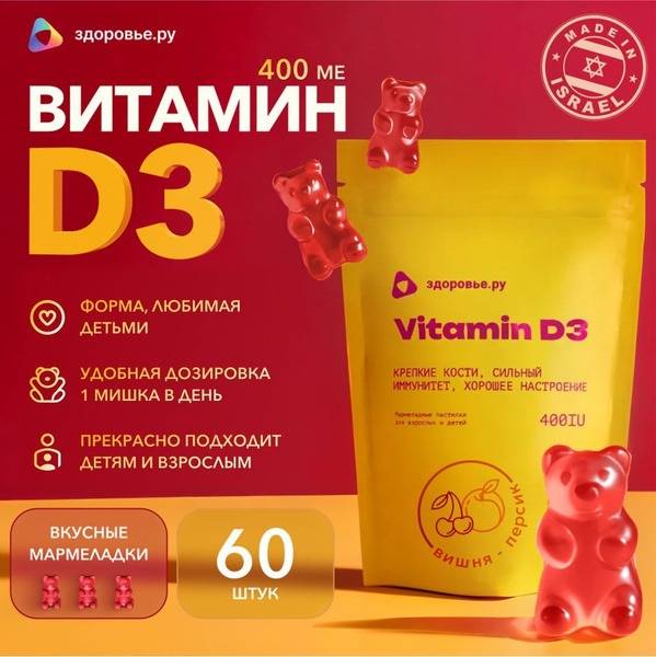 Vitamin D3, Vitamin D gummies, chewable vitamin D, children's vitamins, adult vitamins, bone health, immune support, mood booster, cardiovascular health, skin health, muscle function, insulin regulation, cancer prevention, vitamin D deficiency, Zdorovie.ru, cholecalciferol, peach flavor, cherry flavor, 60 gummies, osteoporosis prevention, rickets prevention, health supplements, dietary supplements.