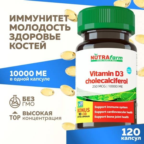 Support your overall well-being with Nutrafarm Vitamin D3 10,000 IU (250 mcg), a high-potency supplement providing a bioavailable and easily absorbable form of cholecalciferol. This essential nutrient contributes to healthy bones and teeth, strengthens the immune system, boosts energy levels, and supports cognitive function. The high dosage helps raise vitamin D levels to optimal ranges, promoting mood, focus, muscle tone, and cardiovascular health. Ideal for preventing deficiencies and supporting bone density. Each bottle contains 120 capsules.