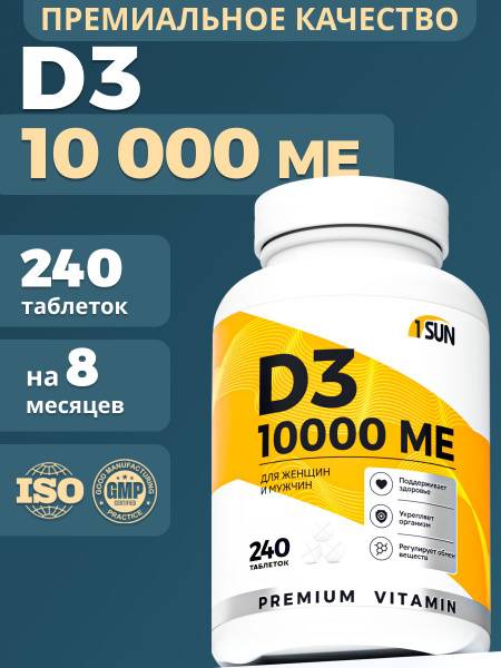 Boost your health with ONE SUN Vitamin D3 10000 IU (240 tablets). This high-potency supplement supports immune function, calcium absorption for strong bones, and joint health. Vitamin D3 plays a crucial role in regulating mineral metabolism, contributing to overall well-being in both men and women. It may also help maintain healthy blood sugar levels.