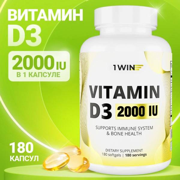 Vitamin D3, Vitamin D, 2000 IU, 180 capsules, cholecalciferol, bone health, immune support, calcium absorption, phosphorus absorption, musculoskeletal health, metabolic health, insulin sensitivity, blood clotting, cholesterol, inflammation, respiratory health, 1WIN, supplements, health supplements, dietary supplement