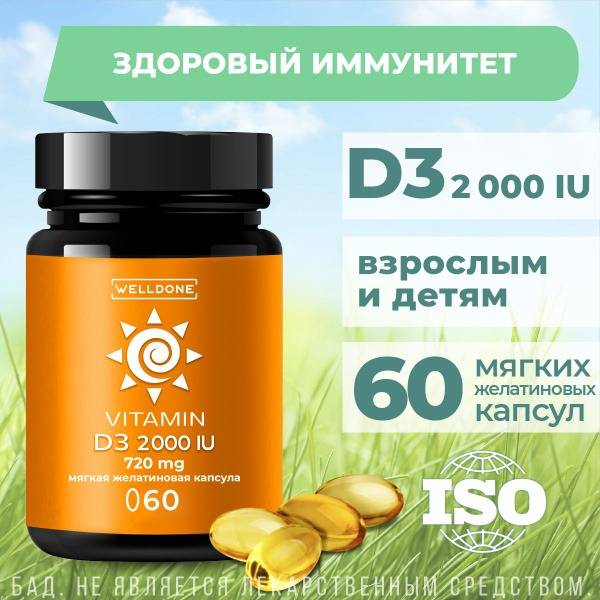 WellDone Vitamin D3 2000 IU (cholecalciferol) softgels provide a highly absorbable, natural vitamin D3 solution in a convenient oil-based formula. Studies show that a significant portion of the population suffers from Vitamin D deficiency – boost your health and well-being with WellDone's potent 2000 IU dosage.