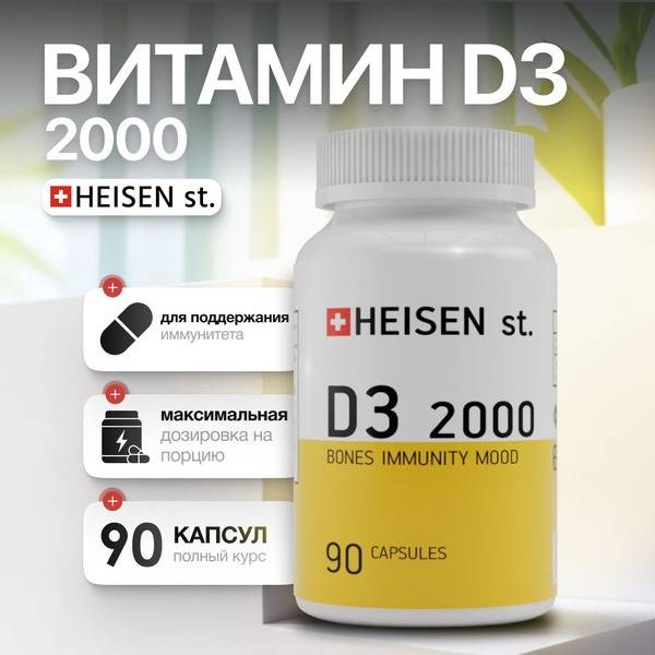 HEISEN Vitamin D3 2000 IU (2000 ME) is a high-quality dietary supplement providing a potent dose of Vitamin D3 to support your immune system and metabolism. Each capsule delivers 2000 International Units (IU) of Vitamin D3, contributing to optimal health and wellbeing. Adults take one capsule daily for one month. Repeat as needed. Consult your doctor before use, especially if pregnant, breastfeeding, or have allergies. Store in a cool, dry place away from direct sunlight. Expiry: 2 years. Made with HEISEN standards (Switzerland). Supports immune function and healthy metabolism.