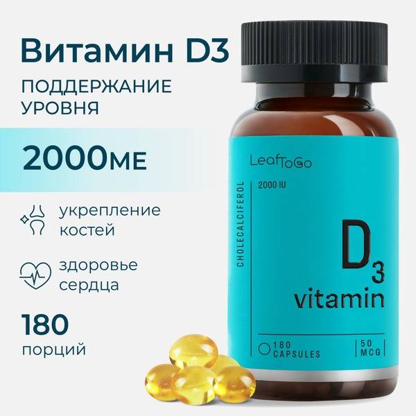 Vitamin D3, Vitamin D3 2000 IU, cholecalciferol, immune support, bone health, muscle health, sleep, cognitive function, osteoporosis prevention, LeafToGo, dietary supplement, БАД, Russian supplement, healthy lifestyle, self-care, calcium regulation, phosphorus regulation, Omega 3, B vitamins, multivitamins, 180 capsules, gelatin capsules.