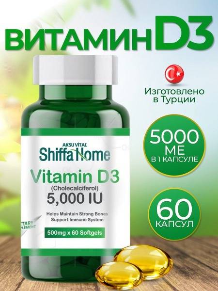 Vitamin D3, 5000 IU, Aksu Vital Shiffa Home, Turkey, supplement, immune system, bone health, muscle health, cardiovascular health, hormonal balance, weight management, skin health, hair health, nail health, men's health, women's health, osteoporosis prevention, mood booster, fitness, athletes, health and wellness, dietary supplement, vitamin d deficiency, buy vitamin d3, vitamin d3 capsules, 60 capsules.