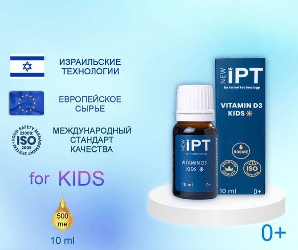 Description: newIPT D3 Kids Vitamin D3 oil drops are colorless, tasteless, and odorless, making them perfect for children of all ages, including infants. Vitamin D3 is essential for children's health, supporting strong bones and teeth, a healthy immune system, reduced risk of colds, and improved memory and speech development. It also helps prevent rickets. These D3 drops are part of a comprehensive vitamin regimen to aid concentration and learning in children and adolescents. They help normalize carbohydrate metabolism, replenish vitamin D3 deficiencies, and maintain optimal levels. Pediatricians recommend supplementing with vitamin D3 year-round.