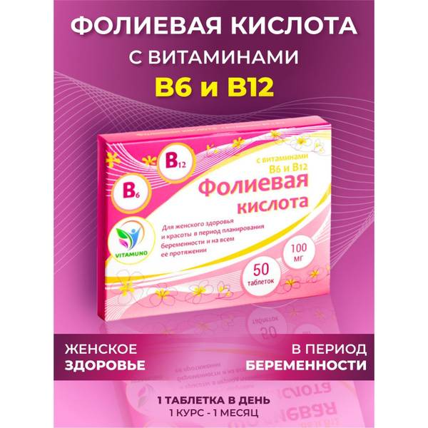 Vitamuno Folic Acid with Vitamins B6 and B12 is a dietary supplement providing essential nutrients crucial for overall health and well-being, especially for women planning pregnancy. Folic acid plays a vital role in cell growth and development, contributing to healthy skin, mucous membranes, and hair. It's particularly important during early pregnancy, as it's essential for fetal development and preventing neural tube defects. A deficiency can lead to serious complications.