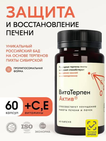 VitaTerpen Active is a dietary supplement formulated to support liver and kidney health, improve metabolism, and help prevent stone formation. Scientific studies show that Siberian fir terpenes possess hepatoprotective and detoxifying properties. These natural terpenes: