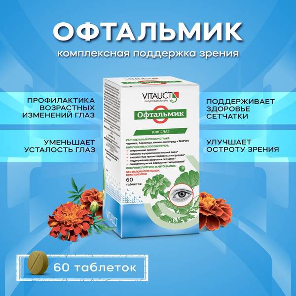 Ophthalmic VitaUkt, eye health supplement, eye vitamins, macular degeneration, diabetic retinopathy, myopia, night vision, antioxidants, taurine, bilberry, marigold, lutein, zeaxanthin, ginkgo biloba, grape seed extract, eye protection, vision support, 60 tablets, herbal supplement, natural eye care.
