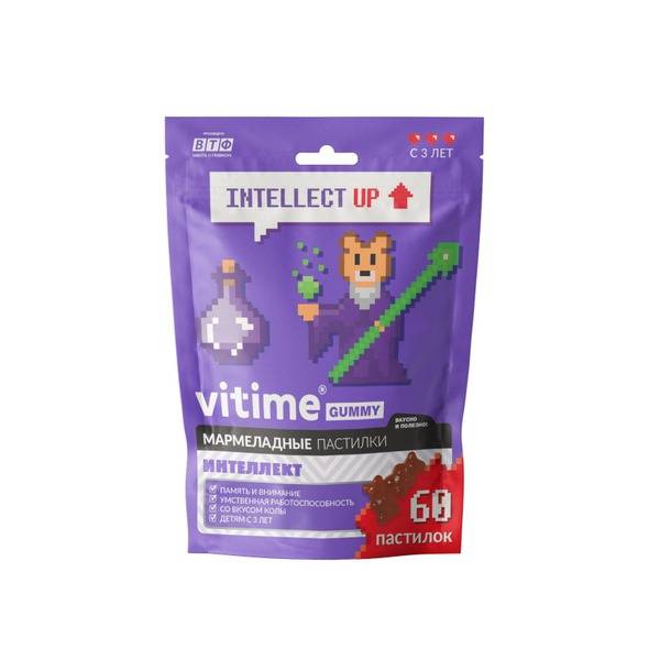 Keywords: children's vitamins, brain health, memory support, focus, concentration, cognitive function, gummies, supplements, kids vitamins, glycine, choline, magnesium, vitamin B6, cola flavor, no GMO, natural, healthy brain, child development, academic performance, stress relief, VITime, INTELLECT, 3 years+, dietary supplement.