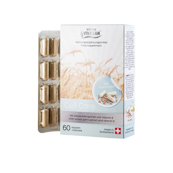 Vivasan Cell Care capsules deliver a potent blend of highly concentrated wheat germ extract and Vitamin E. Wheat germ extract is rich in spermidine, a polyamine found in many foods that's shown to promote cellular health. Studies suggest spermidine activates cellular autophagy (self-cleaning), potentially offering protective effects against age-related neurological diseases like Alzheimer's and Parkinson's. A 2018 American Journal of Clinical Nutrition study (829 participants aged 45-84) linked higher spermidine intake to increased longevity. Participants followed spermidine-rich diets for years, demonstrating a correlation between increased spermidine consumption and extended lifespan. This synergistic combination of spermidine and Vitamin E in Cell Care capsules supports optimal cellular health and well-being. Item # D 238. 60 capsules, 476mg per capsule. Consult your physician before use. Store in a cool, dry place, away from sunlight and out of reach of children.