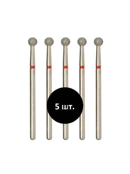 This diamond nail drill bit (dental bur) features a sphere shape with a fine red grit, perfect for delicate manicure and pedicure treatments. Part number 856.104.001.000.040. This versatile attachment is ideal for e-file manicures and pedicures, offering gentle cuticle smoothing, removal of small calluses, and refining skin roughness. It excels at side wall and sinus preparation, internal natural nail correction during enhancements, and nail piercing.